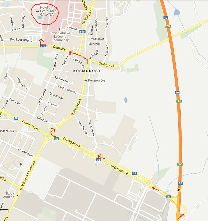 - ze silnice E65/R10 odbočte na exitu 46 Mladá Boleslav - Průmyslová zóna